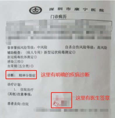 d、门诊病历或者疾病诊断书:康宁医院、各指定医院临床心理科看病后有相应的门诊病历或疾病症断书,具体样式如下图所示: