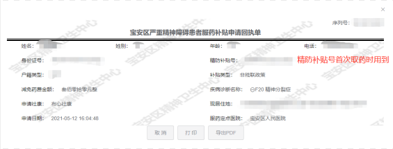 患者的服药补贴经宝安区慢病院审核通过后。社康医生登录申报系统,进入“服药补贴办理进度”页面,点击“查看”回执单,选择下载PDF转发给患者或家属(或直接打印后交由患者或家属)。