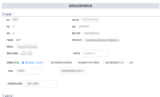 患者在宝安区内居住迁移,根据属地管理原则,深圳市精神卫生防治管理系统内档案会进行迁移,宝安智慧政法信息综合平台上档案也会进行迁移,而患者的免费服药也可以进行取药地点变更,变更前先要确认变更的目标医院是否有患者所需的药物或替代药物,如果有则请原档案所在的社康医生登录服药补贴申报系统内发起变更申请,然后再请慢病院进行后台审核,慢病院审核通过后变更完成。