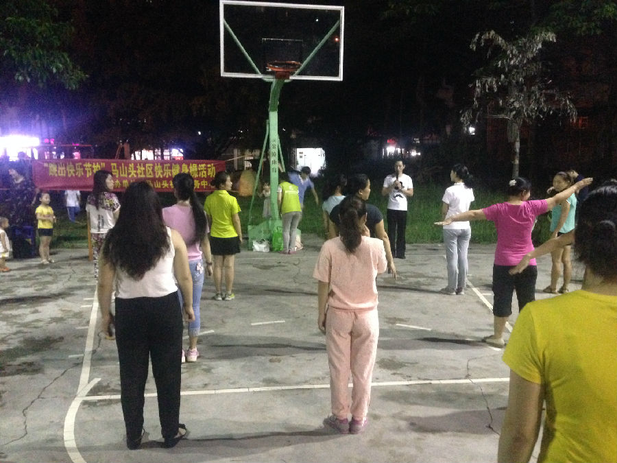 5月14日晚上,马山头社区服务中心整合社区内现有的资源,联合宏燕舞蹈培训机构的专业老师,在马山头村委篮球场开展了公益的健身操活动。活动旨在通过健身操这种健康的娱乐方式,促进居民之间的交流,从而倡导快乐健康生活,建设快乐社区。活动现场有近50位居民参与其中,活动过程中还不断有居民加入我们的队伍中来。本次健身操活动为常规活动定于5-月每周四晚上7:20-8:30举行。