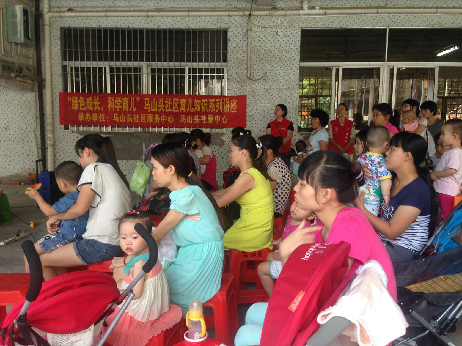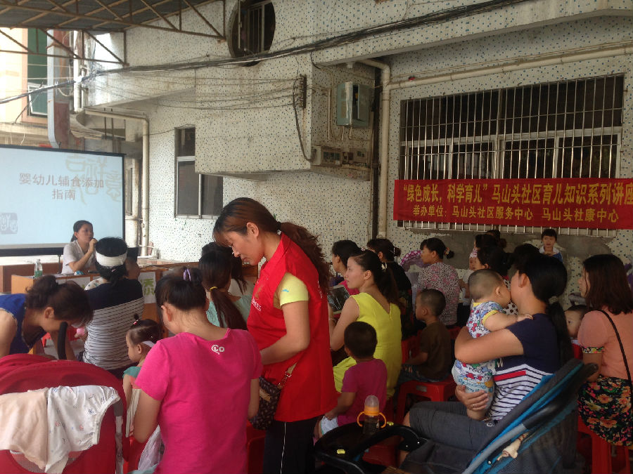5月15日下午,马山头社区服务中心为响应光明新区科学育儿服务政策,满足社区居民育儿知识的需求,联合马山头社康中心开展了主题为“绿色成长,科学育儿”育儿知识系列讲座。本次活动吸引了近50位妈妈参加,现场社康医生给居民讲解了0-3岁幼儿辅食添加的基本知识和喂养技巧,并现场和居民互动交流解答妈妈们提出的各种育儿方面的问题。活动现场派发育儿有关宣传册和社区宣传购物袋共记50份,受到了居民的欢迎。