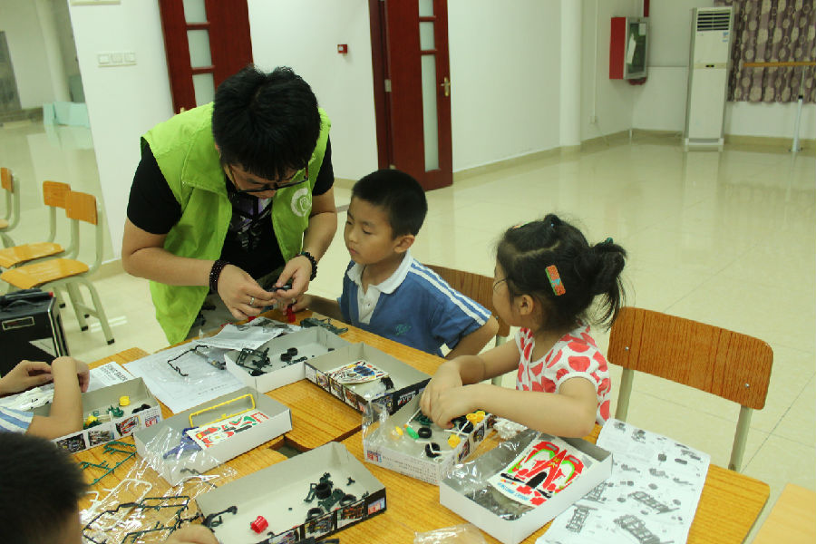 义工正在向小朋友们讲解模型车拼装步骤