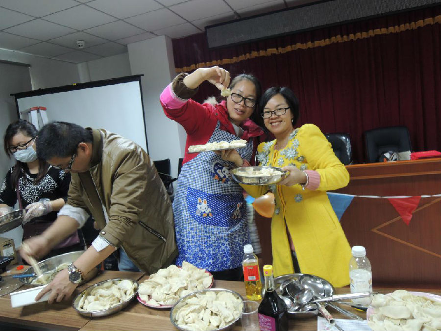 项目介绍告一段落后,“指五官”的小游戏让大家high起来,大家面对面哈哈大笑,指错五官的宝贝们接受惩罚都大胆表演拿手才艺;大家熟悉后开始此次活动的重头戏--包饺子了,宝贝们带好手套跃跃欲试,等待家长们把馅剁好拌好就开包,妈妈们也耐心的教宝贝们包水饺,大家其乐融融的包饺子并一起分享相互学习新的饺子样式,张女士开心得意的说:以后把我新学的这几种向她们炫耀一下;大家满足的享受自己的劳动成果,宝贝们开心的说饺子很好吃。