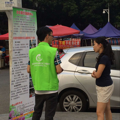 11月19日,白石厦社区服务中心的社工们在白石厦彩虹缤纷城门口进行社工宣传活动。本次活动主要宣传3个目的,一是义工招募,二是4点半课堂成员招募,三是希望增加居民对白石厦社区服务中心的知晓度和信任感。