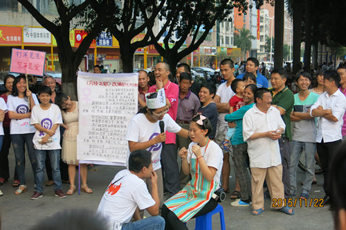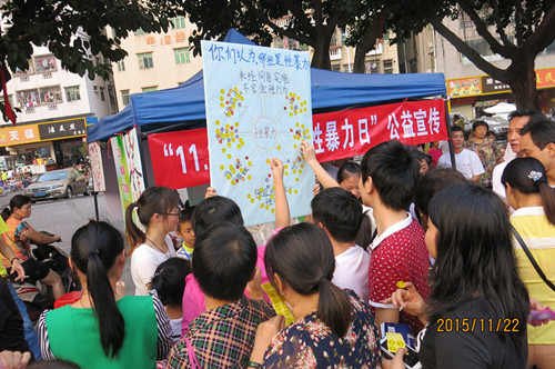 很多人对家暴的理解是肢体的暴力,但在很多家暴事件中往往是精神暴力、性暴力、经济控制等多种暴力形式同时存在的。现场反暴力宣传形式精彩多样,活动刚开始,就是一场精彩的舞蹈表演,现场青工义工透过反家暴的舞蹈,号召反对家暴,消除暴力。另外,义工们把从身边发生的或曾经听过的一些家暴故事改编成小品,在活动现场给大家展现出来。小品主要讲述了精神暴力及暴力反复的问题,鼓励受害者敢于去反抗家暴。