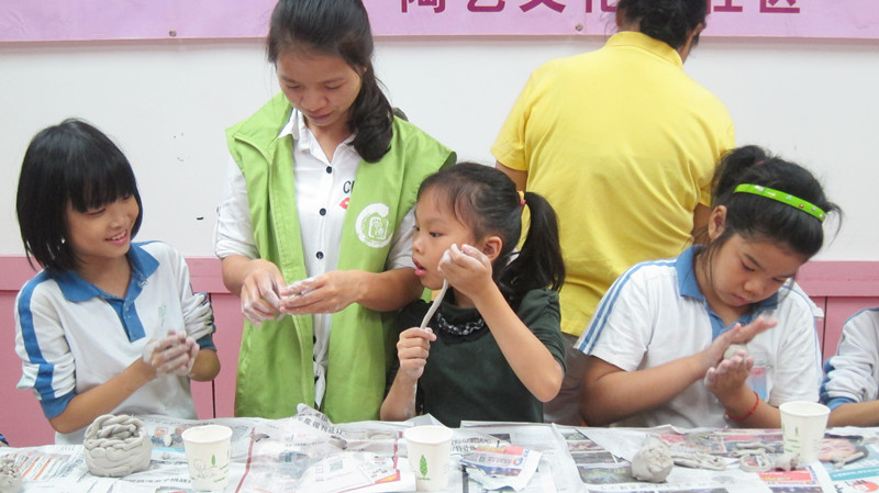 此次陶艺文化学习小组的对象是6-12的青少年,有15名青少年参与学习,小组一共开展了7节。从学习陶艺文化的理论知识到陶泥实践操作,从对陶泥的整体认识到陶泥捏制技巧,从陶泥半成品到为陶泥上釉等。社区的孩子们很少有机会接触了陶艺的手工制作,不但孩子们充满好奇心,大人们也十分的感兴趣。社工教孩子们陶泥的捏制技巧,根据孩子们的接受能力和兴趣,捏制了可爱的小象,猫咪图案的小碗,鱼骨状的小碟,乖巧的小绵羊等等。学习过程中,年龄较小的孩子,在父母的陪同下共同学习,一起完成作品;年龄大一些孩子,则在陶艺老师的教授下,独立完成作品;还有一些孩子在学习过程中互相认识,成为了好朋友,然后共同合作完成作品。