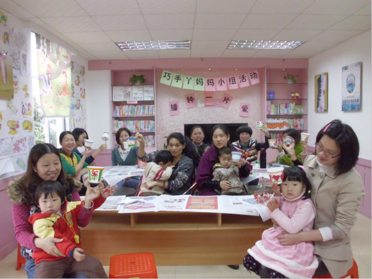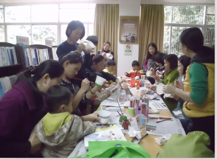 此次活动是妈妈DIY自己的创意花盆,并播撒花种。活动开始了,妈妈们首先在颜料盘上调出色彩鲜艳的水粉颜料,然后在社工提前准备好的白色塑料花盆上写写画画,用色彩点缀出自己喜爱的图案,接着装上调好的营养土,最后撒下各种花的种子,这样一盆盆创意的作品就出炉了。