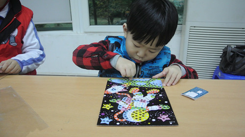 工作坊由纸绳粘贴画、创意纽扣画、马赛克贴画、圣诞搓纸画、布艺盆栽花等手工小组组成,从不同方面、循序渐进地训练青少年的动手能力,丰富他们的课余生活。在各节小组中,参加活动的小朋友都表现出了极大地热情和兴趣,不仅在规定的时间内完成了手工制作,还热心的帮助还未完成制作的小伙伴。
