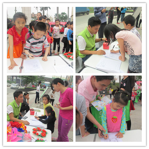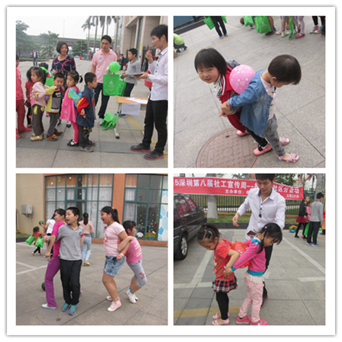 活动分为:游戏互动、咨询服务、社工服务资源手册发放、宣传展板等环节。游戏环节设计了互动环节,动手能力环节。一在提高孩子们的动手能力,二是让孩子和家长之间有一个互动沟通的机会,能够一起玩耍。