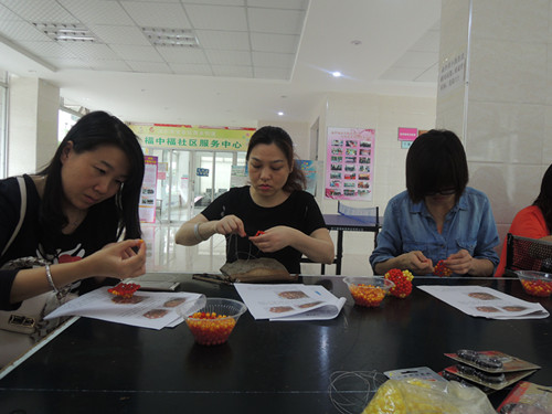 “作为家庭主妇,小孩上小学后,就有更多的闲暇时间。渐渐开始做自己喜欢的兴趣爱好,看到社区服务中心开设了串珠活动,马上就报名了。从最开始简单的杯垫、玫瑰花到最后比较复杂的灯笼、花瓶,串珠摆件越来越多,步骤越来越难。手工活动开设的初衷是让大家有事做,顺带着自娱自乐,让生活多姿多彩”黄姐说道。