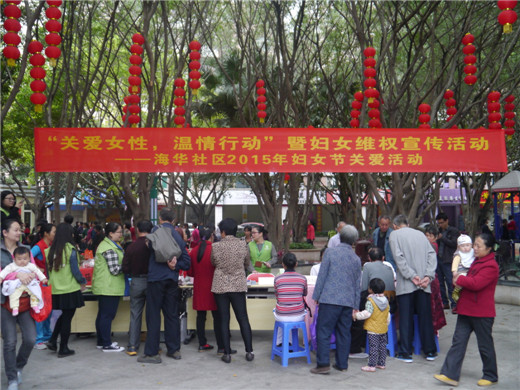 为了庆祝“三八”妇女节,新安街道海华社区妇工委、海华社区服务中心为提高辖区妇女群众的法律素质和健康意识,特邀请驻点海华社区工作站律师——赵海辉和深圳市同仁医院的医生于3月6日上午,在48区海华公园开展了“关爱女性,温情行动”妇女维权宣传活动。
