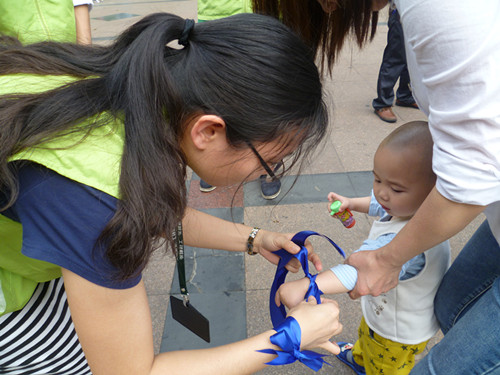 社工给小鹏与佩戴蓝色丝带